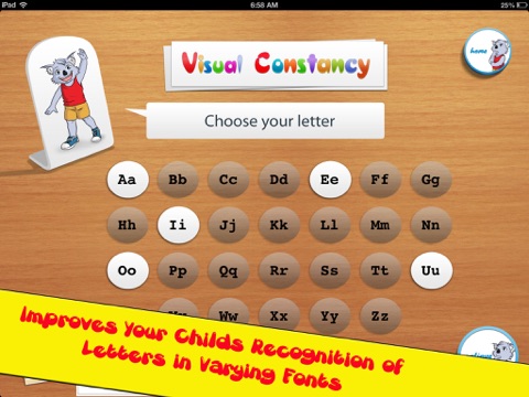 Learning to read with Byron is a reading game, which specifically targets the development of visual form constancy. It was created to provide a reading app for kids to develop their skills in identifying letters when presented in different fonts or forms. Many students have difficulties with recognizing letters when they are presented in different fonts. Visual Constancy is the ability to mentally manipulate forms of the letters. This skill helps children distinguish differences in size, shape and orientation. Students with Visual Constancy difficulties often reverse letters and numbers.