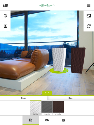 Simply use the LECHUZA App to see how our planters and furniture will look in your home or on your patio. Choose between different designs and be inspired -absolutely free! Test different sizes and colors in the environment you choose and compare planters or furniture. Take pictures and use them in your personal design or share your LECHUZA photos with others. For proper orientation, the app needs a marker like the LECHUZA catalog or a special paper marker, available on the LECHUZA website.