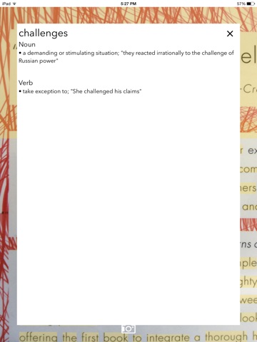 To use Lectio, place the text you want to read on a flat surface. Center the text in the camera window and snap a picture. Tap on any word highlighted in yellow and Lectio will read it aloud. Tap and hold the word on the screen for definition to appear.