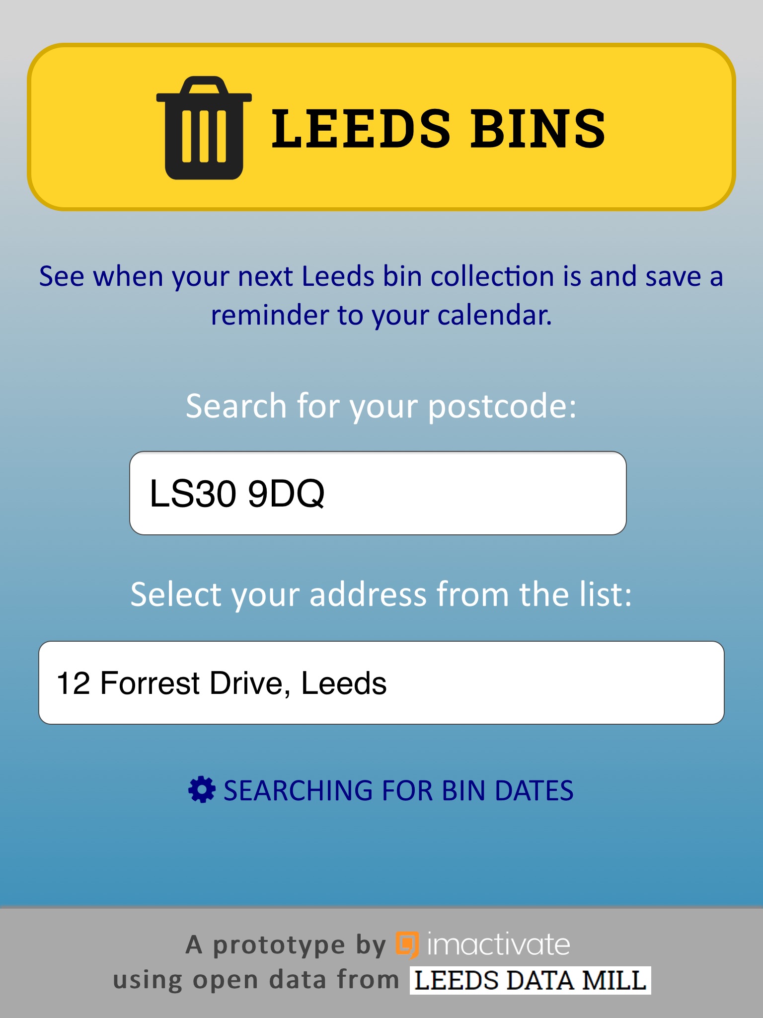 The Leeds Bins app allows you to easily obtain bin collection information in Leeds, West Yorkshire. Input your address to see your Black, Green and Brown bin collection dates for the next six weeks. With the app you can save these dates to your devices calendar and specify when you are reminded of upcoming collections. Also, see where your nearest recycling points are on an interactive map. Please note that bin collection date searches may not work for flats with shared bins.