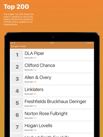 Legal IT Insider’s new app for iPhone and iPad is designed and optimised for iOS7 and includes the Latest News stream plus access to the exclusive content in our famous free monthly newsletter. Integrated into the app are the Insider’s Top 200 UK and Global charts showing the major IT systems in use by the world’s top law firms.