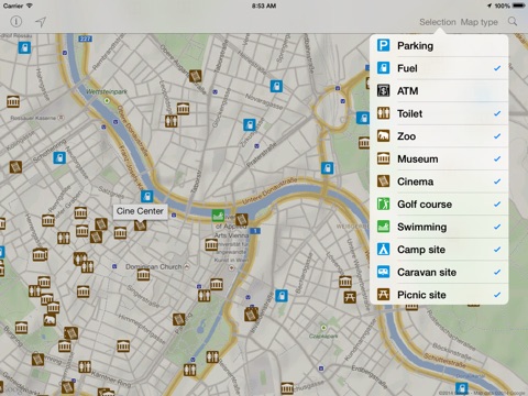 LeisureMap shows many types of recreational facilities neatly arranged on the maps of your iPad, iPhone, or iPod touch. All types can be displayed independently. Switch between Google Maps or the built-in maps at any time. With Google Maps you can rotate and tilt the maps. LeisureMaps is available for many countries. More countries are constantly added.