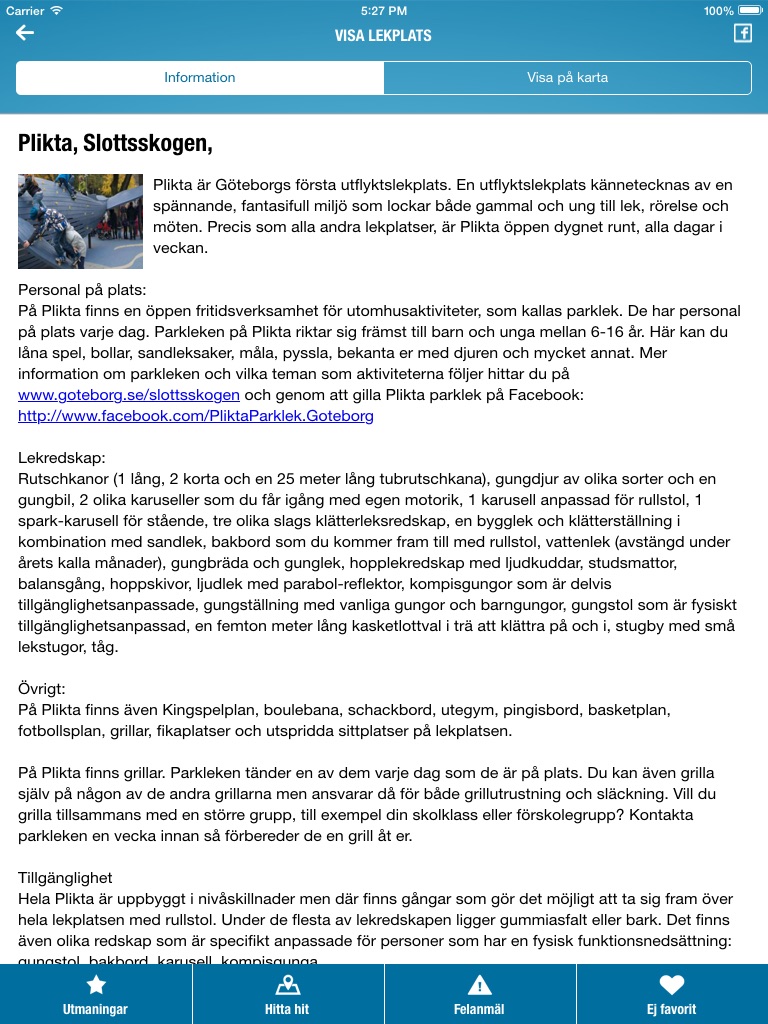 Lekplatsappen är framtagen av Göteborgs Stad, park- och naturförvaltningen. I appen är det lätt att hitta till 150 av Göteborgs lekplatser men också att se vad de erbjuder samt vilken som är närmsta hållplats.