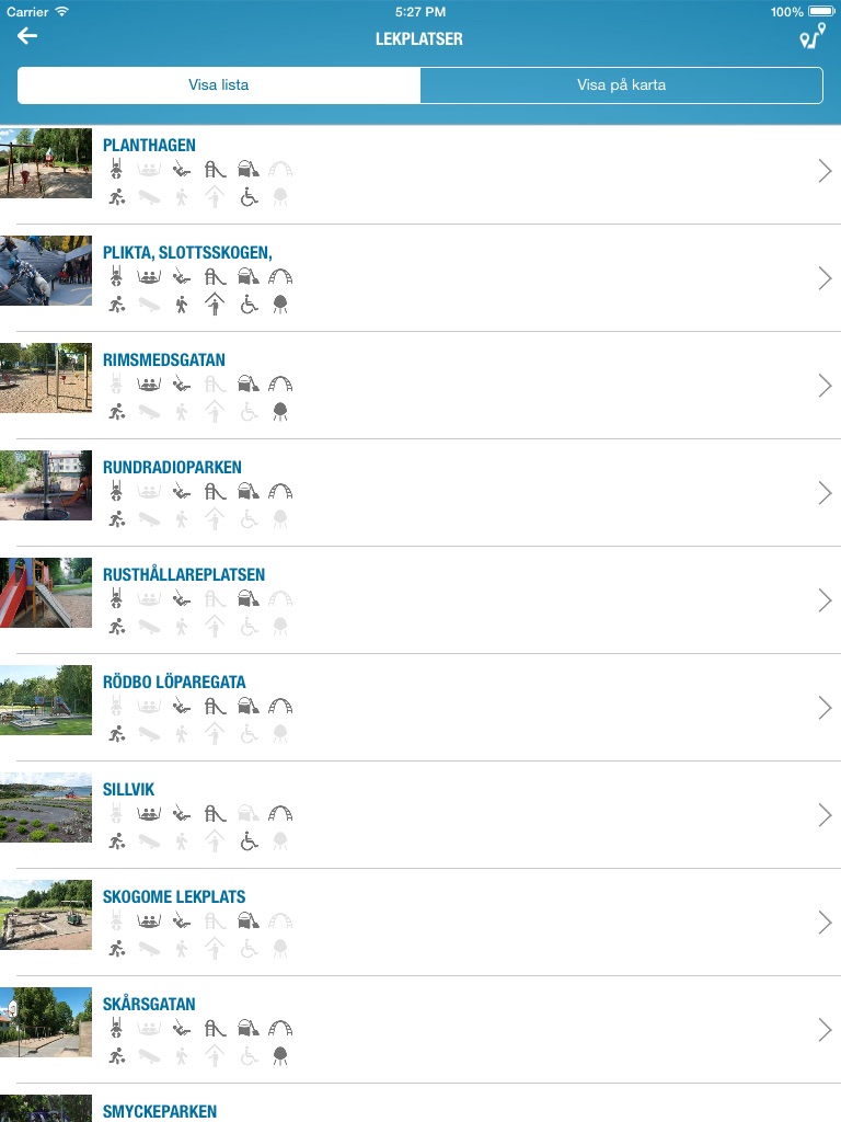 Du kan snabbt och enkelt söka på lekplatser utifrån olika egenskaper, som t ex gunga eller rutschkana. Resultaten kan du se på en karta eller i en lista.