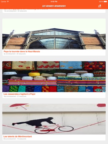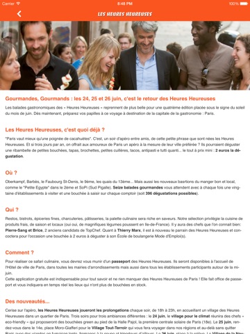 Trouver et visualiser (sur une carte ou sur une liste) le parcours culinaire idéal parmi les 16 balades gourmandes imaginées pour les Heures Heureuses.
