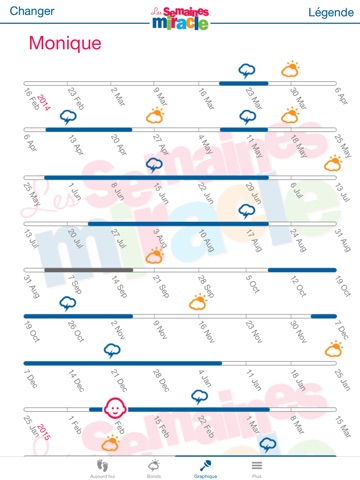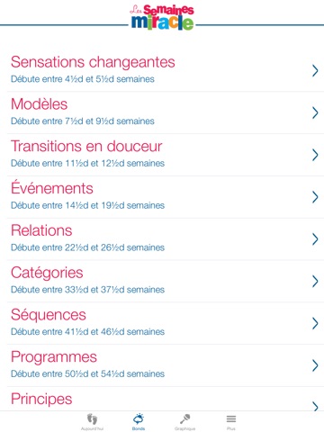 L’application Les semaines miracle pour les bébés qui est un best-seller, est un calendrier hebdomadaire personnalisé du développement mental de votre bébé qui vous tiendra informée des bonds et des périodes dagitation de votre bébé.