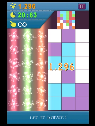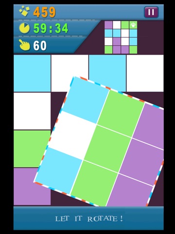 Tap the screen,you can rotate the color tiles. If the same color tiles rotate into one line or one column,then they will explode,and you will get points and time reward. Let it rotate! Youll find this is challenging and Addictive.