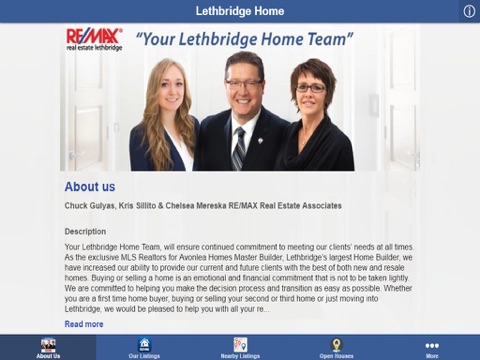 Lethbridge Re/Max real estate agent, Chuck Gulyas’ App is the best way to search local real estate listings right from your mobile device. This app is designed to help you the buyer and seller with the tools for all of your real estate needs. Whether you’re walking your neighborhood, out for a Sunday drive, or comparison shopping in a new part of town you will have all the information you need all at your fingertips. Chuck’s App is an essential tool for anyone who is considering buying or selling real estate anywhere in Southern Alberta. Also included in this easy-to-use app is a Mortgage Calculator, which makes it very easy to approximate your future mortgage payments, based on interest rate and terms of the loan. We look forward to serving the real estate needs of you, your friends and family.
