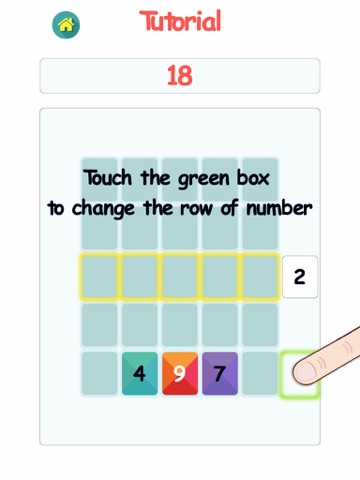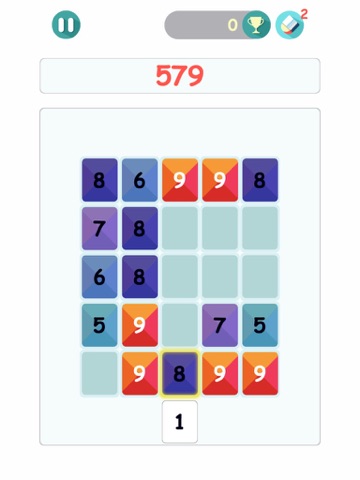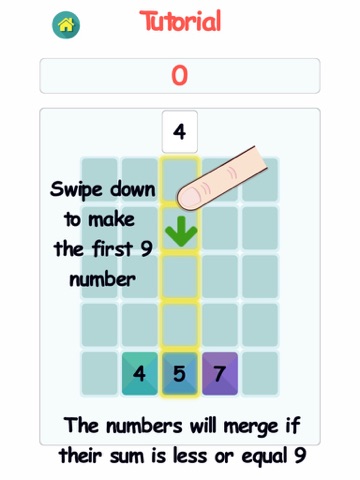 the goal is to push the number on edge to column or row to the grid. Number will merge if their sum is less or equal 9, challenge you to place five 9 near each other horizontally or vertically to make them disappear and get 45 points.