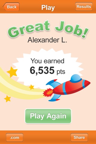 • Play: This section provides a fun game helping kids recognize letter sounds in common words. Children have 90 seconds to answer as many questions as possible while earning points.