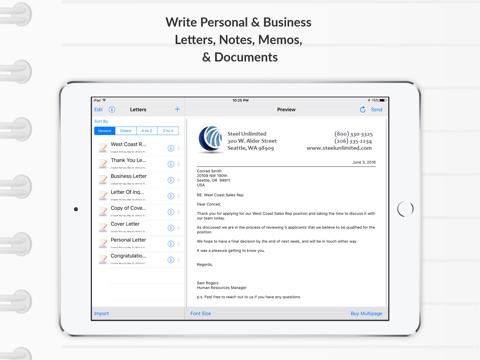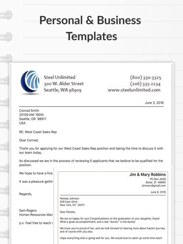 *** An easy and convenient letter writing app and editor that allows you to create personal and business documents, memos, notes, and letters on the go. Use a Bluetooth enabled keyboard, or even your built-in “voice recognition” feature to type or dictate letters on the go. To save even more time, use the duplicate feature to create similar letters -and- create *UNLIMITED* new documents on the fly. ***