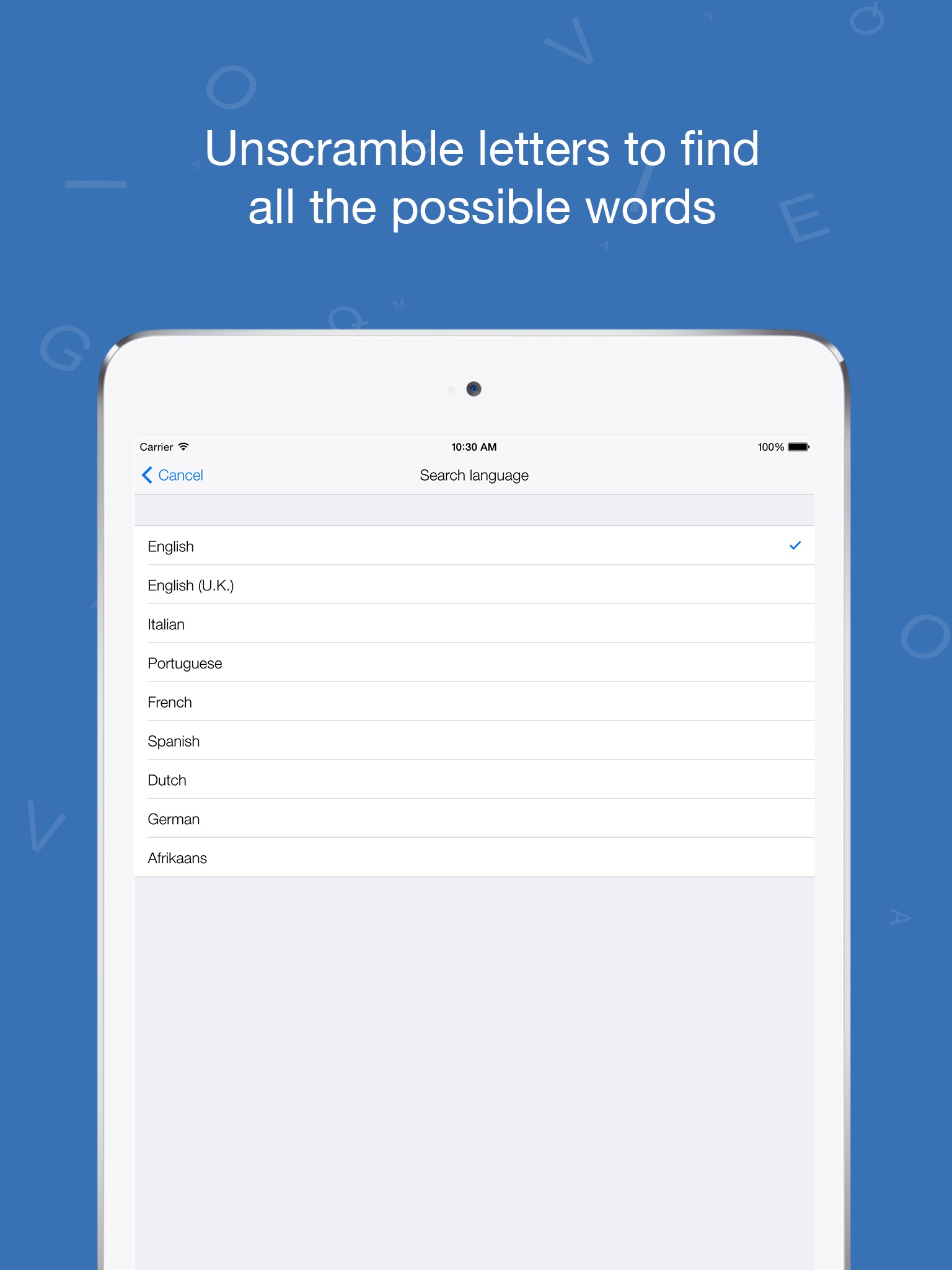 Give this app jumbled letters and it will list all the possible words that can be made with those letters. You have the option of searching through English, Afrikaans, German, Dutch, Italian, Spanish, Portuguese and French dictionaries.