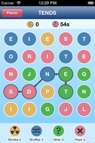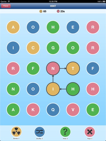 Slide your finger to find words by snaking around the grid! When you find a word, it disappears and new letters drop into place!