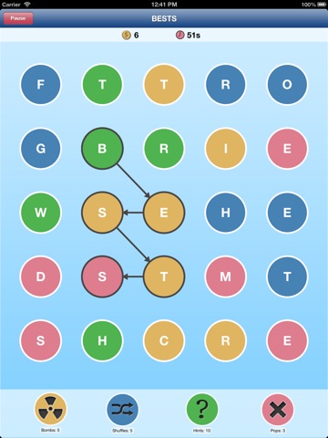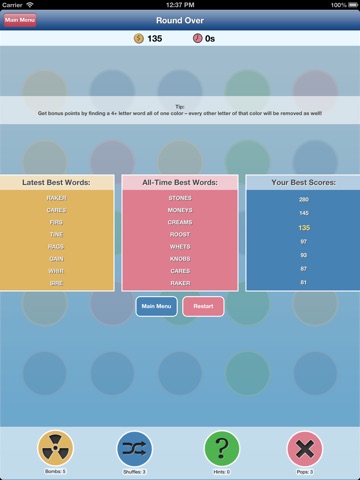 *Bonus* – Get bonus points by finding a 4+ letter word all of one color – every other letter of that color will be removed as well!
