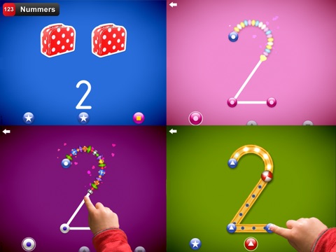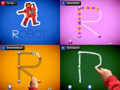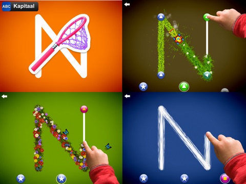 - Boeiende en interactieve speel manieren die het kind ertoe aanzet om drie keer een letter of een nummer te traceren met verschillende moeilijkheden (elke stap is uitdagender).