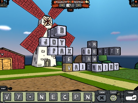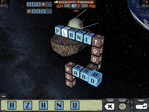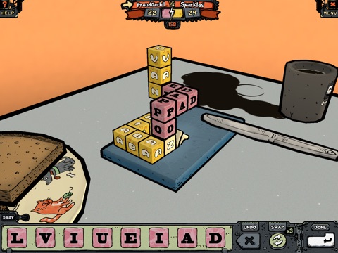 Letterverse is the only game where the battle of the vocabularies takes place in glorious 3D! Each turn players try to use up all their letters to build as many words as possible. Words are detected automatically as letters are placed. Words count forwards, and backwards, and partial words count separately as well. Building words using your opponents letters will steal points from your opponent, giving you an edge. First player to reach the score limit wins.