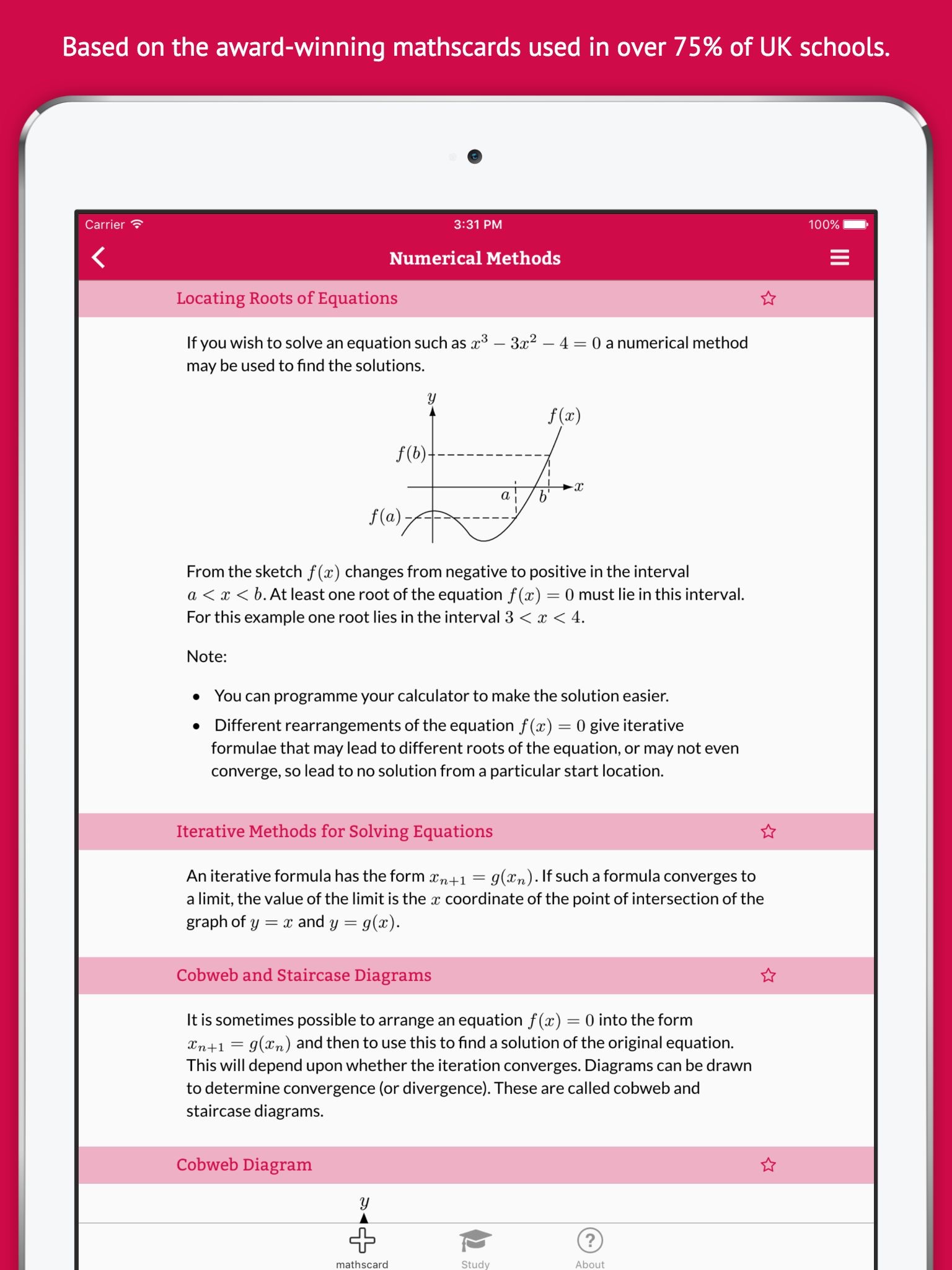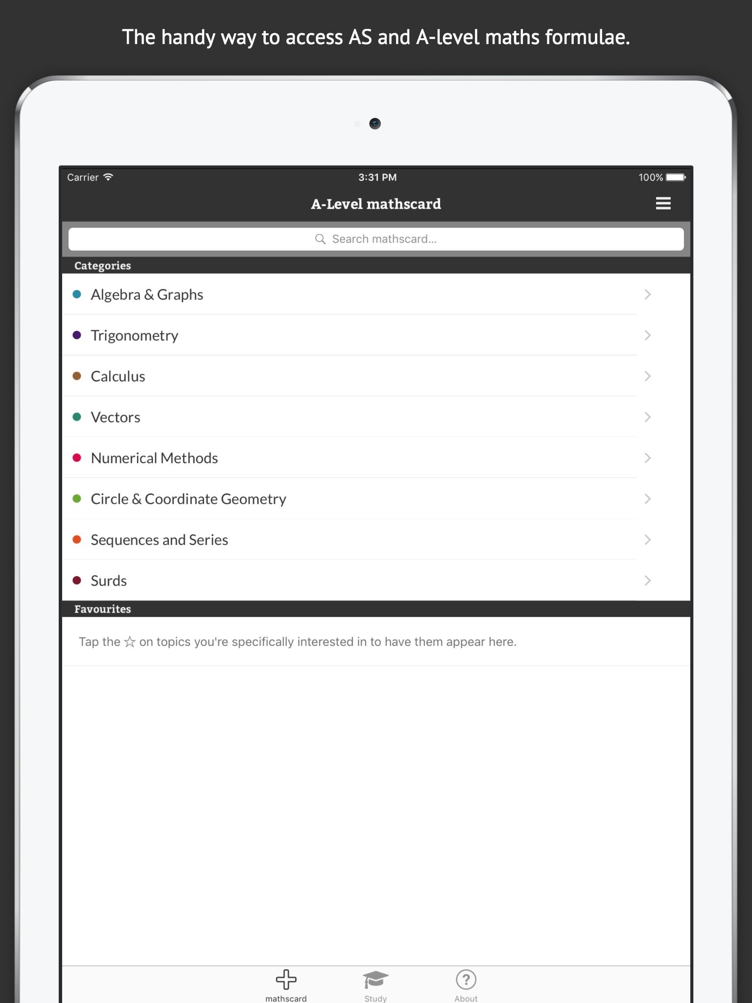 Developed by Loughborough University, the free mathscard app contains hundreds of examples of pure maths formulae and graphs/diagrams. Designed specifically for AS and A-Level maths, the mathscard app is based on the hugely successful award-winning mathscard fold-out formulae sheet and is designed to help students with their maths study and exam revision when at home or on the move.