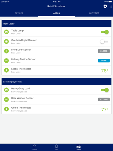 View the status of sensors. Easily adjust lighting loads. Access all thermostats including humidity settings. The Window Covering category facilitates quick open/close of shades and draperies with real-time visual feedback.