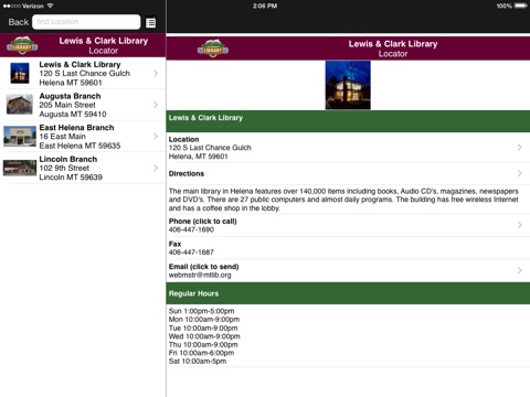 The Lewis & Clark Library is the public library for Helena and Lewis & Clark County in Montana. You can use this app to search the library catalog for books, DVDs, audiobooks, and more, place reservations, renew your items, find a location, and discover what is happening at the Lewis & Clark Library, all from your mobile device.