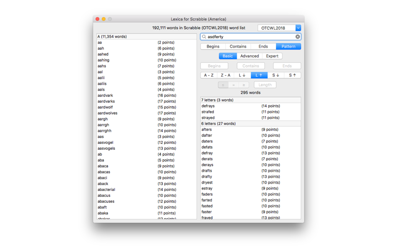 Lexica™ Word Finder is a word search utility, with intuitive, simple ways to search for words allowed in Hasbro, Inc.’s Scrabble® word game using the three word lists for Scrabble tournament play in the United States, Canada, Israel and Thailand: OTCWL2006, also called OWL2 (178,691 words), OTCWL2016, also called OWL3 (188,738 words) and OTCWL2018, also called OWL4 (192,111 words). Switching between the three word lists is a snap. Search for words based on the letters in the beginning, end, or anywhere within the words; or use the powerful pattern match search to find all words containing the letters on your rack. You can even specify one or more letters already on the board and Lexica will provide all the words that can be added on to it using your letters.