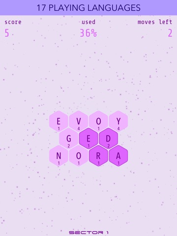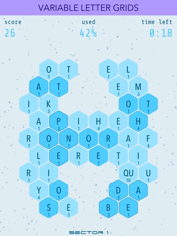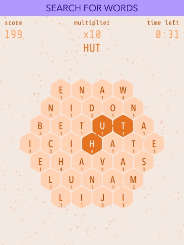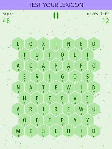 Select the letters on the hexagonal grid to compose valid words from 2 to 12 letters long trying to scoring best.