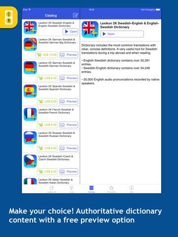 Now you can make sure that a dictionary complies with your language level and contains all words you need before purchase. Full-fledged versions are available for buying with the in-app dictionary catalog.