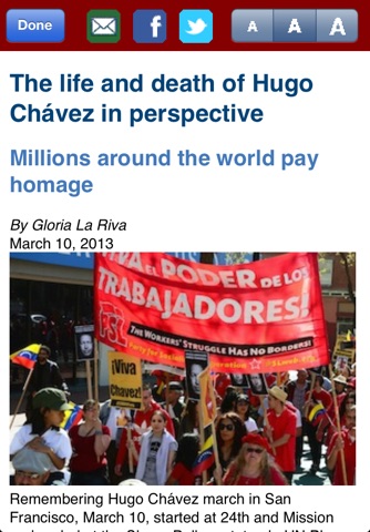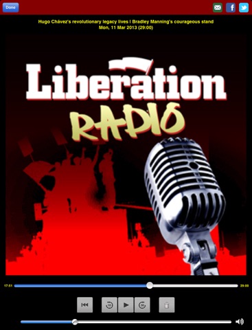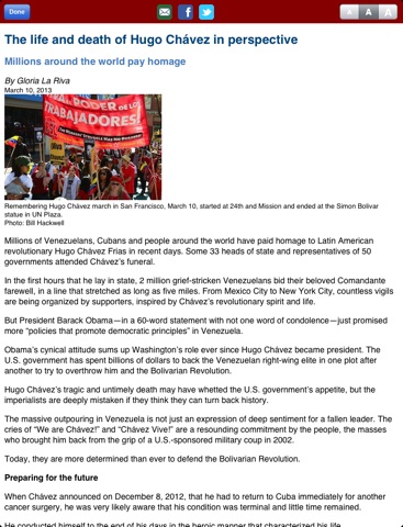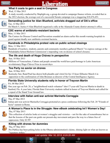 Customized iPhone/iPod Touch/iPad newsreader for the LiberationNews.org. Features user-selectable automatic or manual refresh of article lists from Liberation News, and caching of downloaded articles to read while offline. Download all the latest articles at home or at a coffee shop, then read them on the train or bus, at the gym, or while walking to work (or, for that matter, at work!). Story display is optimized for the iPhone/iPod or iPad, as appropriate. Old articles are automatically purged from the cache when they disappear from the article list. Share articles with your friends via Facebook, email, and Twitter!
