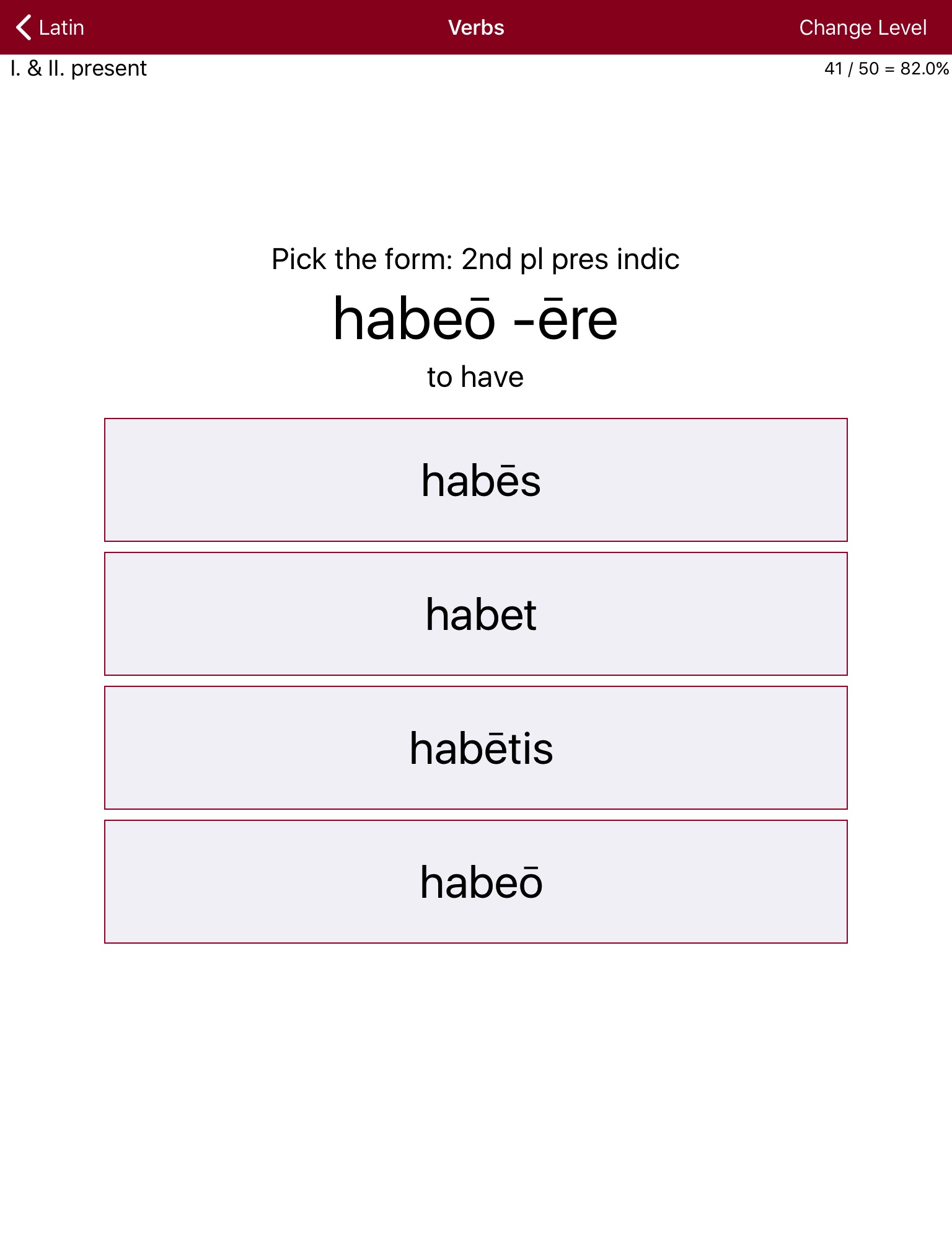 Liberation Philology Latin drills you on Latin vocabulary and grammar, through a continuous multiple-choice test thats instantly available wherever you have your phone and a free moment. Your answers are immediately confirmed or corrected, and reinforced through repetition.
