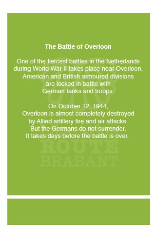 Welcome to the Liberation Route. The Liberation Route is a journey full of experiences along the historic route followed by the Allies through Brabant and Gelderland in their liberation of Europe. In September 1944, the Allies launched Operation Market Garden. This operation failed, but the south of the Netherlands was liberated. After Operation Market Garden, the Allies again became involved in violent fighting with German troops in what has become known as the Battle of Overloon.