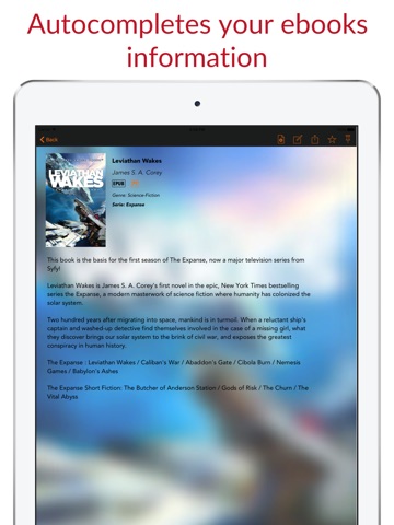 - Autocomplete your ebooks information (genre, summary, series, ratings, artwork…)