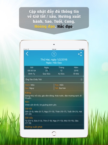 - Cập nhật đầy đủ thông tin về Giờ tốt/xấu, Hướng xuất hành, Sao, Tuổi, Cung, Hoàng đạo/Hắc đạo. “- xem ngay gio*