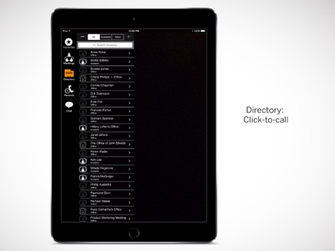• Click to call contacts, rooms, and meetings