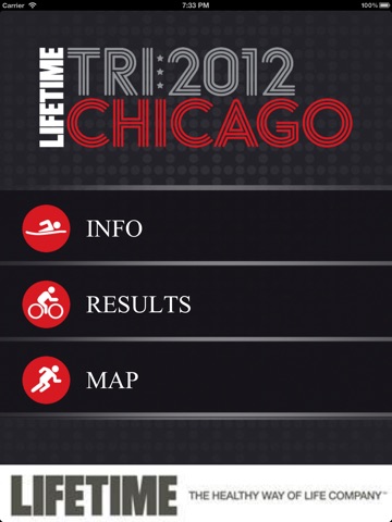 **NOTE 2013 event will use LIFETIME TRI APP available in app store **** 2012 LIFETIME Chicago Triathlon® app allows user to connect with event. Users can find race information, maps, track their favorite athletes, and view race results. Race results will be available at the touch of your fingers powered by the RR:360 results engine™.