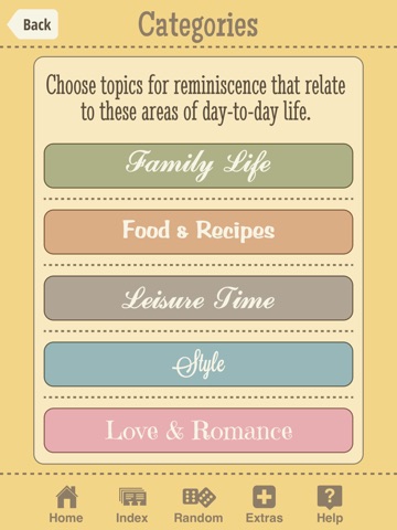 Browse the index of topics featuring vintage photos and written prompts to spark a conversation. Tap to choose a card, swipe right or left to see the previous or next card, enjoy the photo, then tap the bottom corner to flip the card for questions designed to explore four deepening aspects of memory: