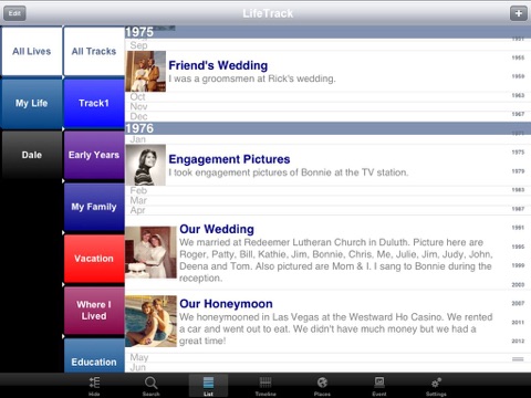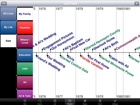LifeTrack features a simple way to organize your life events into separate tracks. Each track may contain any number of events. All of the tracks and events are organized into a life -- your life. Create a life with one or more tracks and many events. Then share it with others through print or a PDF.