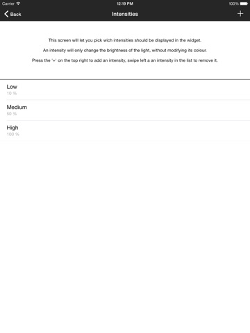 Simple app that does what it says except for one key flaw - the brightness slider only goes down to 40%. This means you cant use it to dim the lights enough for watching a movie or using as a nightlight. Please add the ability for the light to be fully dimmed!