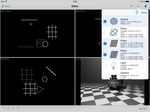 Light 3D computes images from a scene. A scene is composed of several geometric primitives (spheres or planes), one camera and some lights.