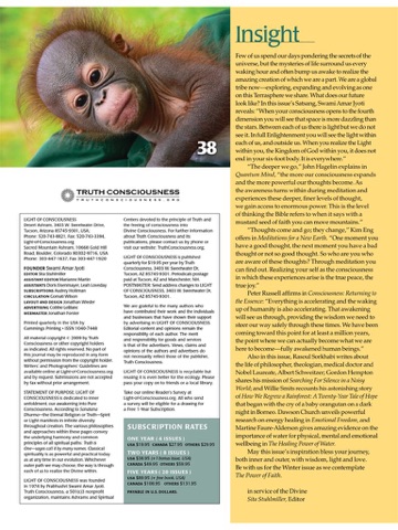 In each issue you will find a Satsang (spiritual discourse) of Swami Amar Jyoti, along with enlightening articles on consciousness, spiritual practices, prayer and meditation, wisdom teachings, science and spirituality, sacred ecology, personal journeys and healing, plus reviews of spiritual cinema, books, audio and DVDs. Recent authors include HH the Dalai Lama, Michael A. Singer, Eckhart Tolle, Bill McKibben, Rabbi Shefa Gold, Brother David Steindl-Rast, L.D. Thompson, Nicole Grace, Amit Goswami PhD, Karen Wyatt MD, and others.