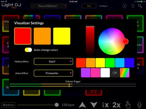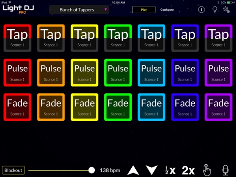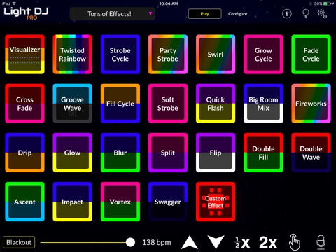 IPAD VERSION: The iPad app offers a DJ Controller-inspired design for ultimate live-performance lighting control. Configurable sheets allow you to setup your effects and colors in advance, and big push-buttons make rapid changes easy.