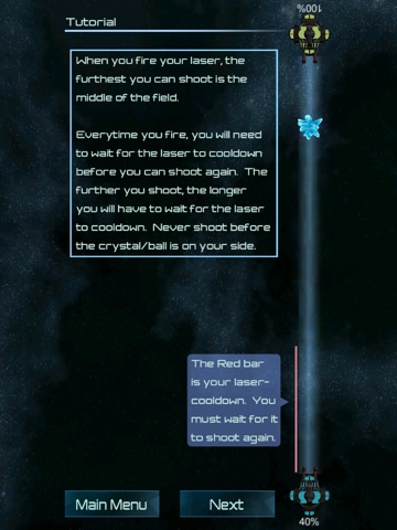 Every time you fire a laser, you will need to wait for the laser to cooldown before you can shoot again. The further you shoot, the longer you will have to wait for the laser to cooldown. This means you should NOT button mash or shoot your laser randomly; you wont hit very many things if you do.