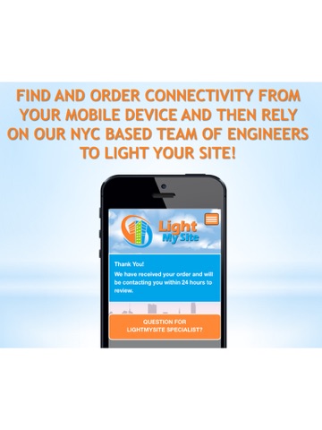 Light My Site is a free app and does not ask for registration in order to see the proprietary information around which ISP’s are lit in your building. In addition to allowing users the ability to order connectivity without ever having to call or speak with a cable or internet providers directly, we are a New York City based team of provisioning and engineering specialists that give users real-time updates on order placement, installation timeframes and carrier due dates, all from the convenience of the Light My Site app on your smartphone.