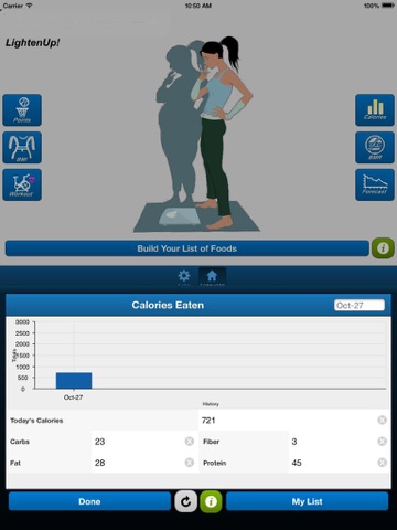 LightenUp! makes it easy for you to make an informed decision about food. In addition, LightenUp! helps forecast how long it will take to reach a weight goal based on individual weight status, calories burned, and calorie consumed.