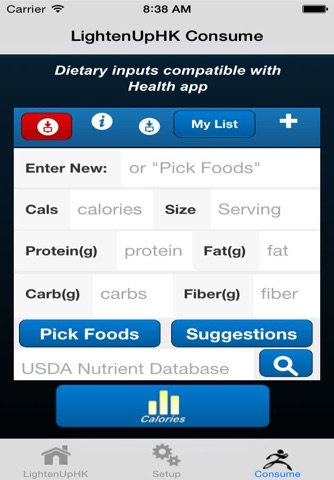 5) In Consume View, define your foods in "My List" with predefined "Pick Foods", "Suggestions", or entering a New Food of your own interest. In addition, input of a food type creates a search of the USDA National Nutrient Database** resulting in a list of returned foods. When food is selected from the returned list, its nutrient values are extracted to be used in apps custom food list building capability.