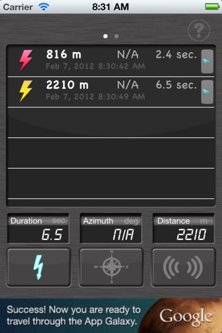 Lightning Distance Calculator is an application witch allows you to measure the distance from a lightning strike basis of the difference in speeds of sound and light. Application also shows the precise impact location based on azimuth determined by the built-in compass.