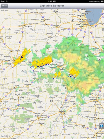 Unlike other lightning applications, we offer a complete national lightning strike map designed for full resolution on your iPad, iPhone or iPod Touch. Use standard gestures to move around the national map, pinch to zoom in and out. Investigate storm cells and lightning strikes nationwide with radar and cloud cover overlays as well as radar looping. The map can be viewed in Standard, Satellite or Hybrid mode. All strikes are colored coded so you can visually determine its age. Red is 0-5 minutes, orange 5-15 minutes and yellow is older than 15 minutes.