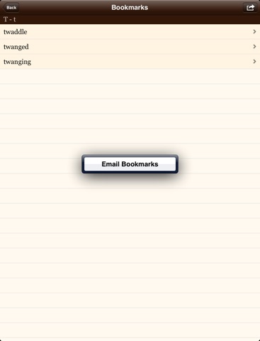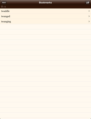 Words of interest can be bookmarked and reviewed later. Bookmarked words are grouped in alphabetical order that greatly simplifies navigation and management.