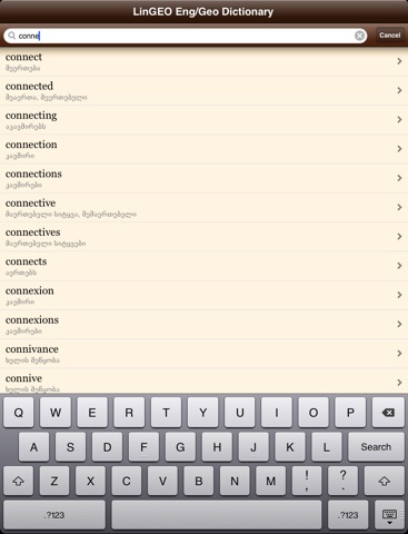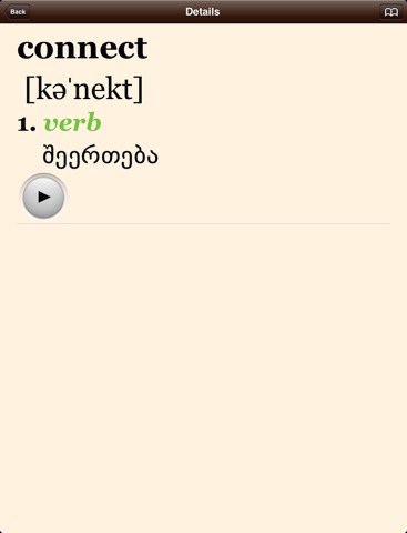 Application offers detailed view of the search words with transcription and all possible Georgian translations.