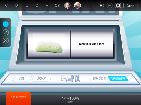 LinguaPix is an engaging iPad app for individuals to practice expressive language skills in three activities: Flashcards, Matching, and Pick or Spin. In the activities, users practice naming, describing, formulating sentences, and more. Up to 8 users in a given activity interact with real photos depicting nouns and verbs from 1 or more of the 15 decks (with an average of 70 cards per deck and a total of 1,035 cards) in the following categories: Animals, Around the House, Body Parts, Clothing, Cooking and Cleaning, Food and Drink (a-m), Food and Drink (n-z), Health and Safety, Hygiene and Personal Care, Occupations and People, School, Sports and Recreation, Tools, Toys and Games, and Travel and Transportation.