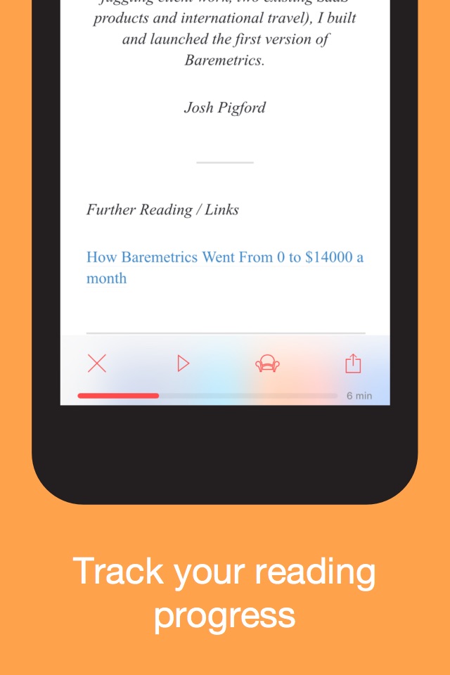 Read your links using Readability view and let Linkpack track your progress, so that you can continue from where you left off. You can even enable narration and have the content read back to you while you are on the move.