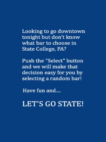 Do you want to go out tonight but cant make a decision on where to go? If you are in State College, PA, Lion Crawl can help! Lion Crawl will randomly select a downtown bar where you can have a great night! Whether you are a Penn State student, local resident or just visiting the area on a football weekend, this app will direct you to a great bar in downtown Happy Valley!